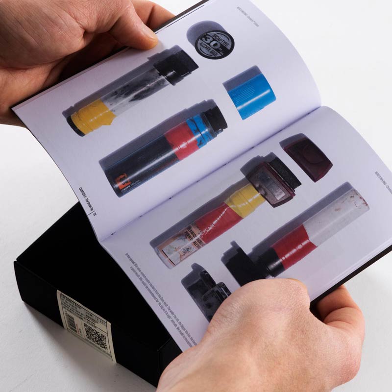 Sættet indeholder et autenticitetsstempel med QR-kode, der giver adgang til en videodokumentar med ekstra eksklusivt indhold. Der medfølger også et A6-hæfte på italiensk og engelsk, som i detaljer fortæller udviklingen af en utrolig historie – hvordan graffiti-maleres behov i starten af 90’erne gjorde denne gennemtrængende og fænomenalt sorte ink verdenskendt.