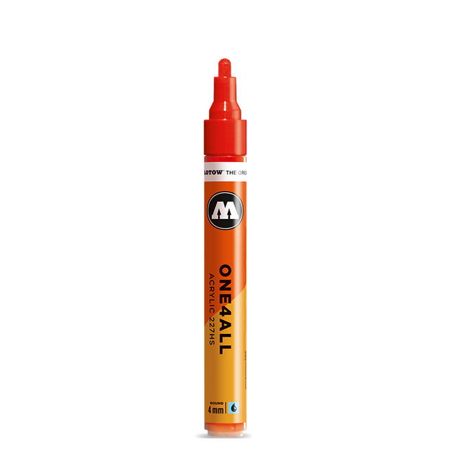Molotows fantastiske ONE4ALL serie indeholder højkvalitets akrylmaling og kan derfor male på de fleste overflader. De fås i 50 forskellige farver og i flere forskellige størrelser tuscher, herunder 1,5mm, 2mm, 4mm, 4-8mm samt 15mm og kan købes både enkeltvis og i flere forskellige sæt.